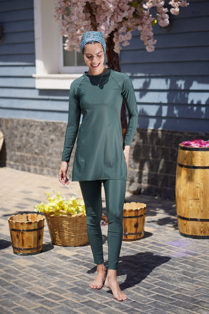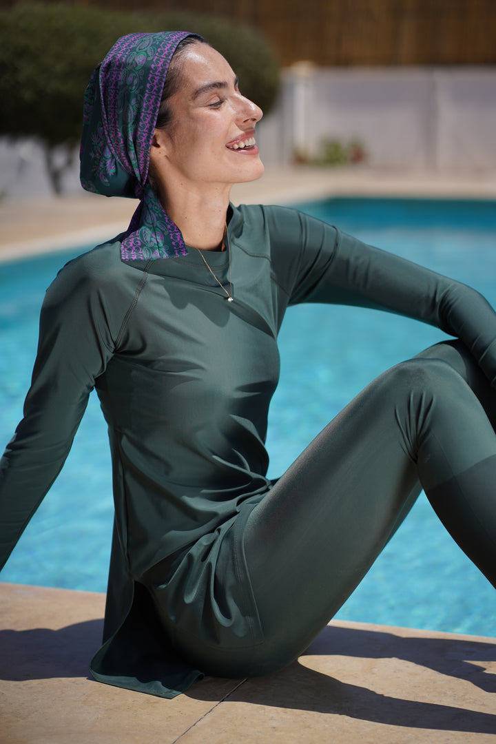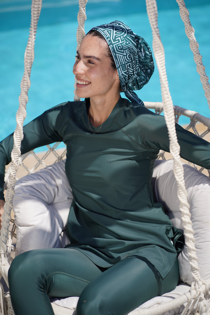 This full sleeve swimwear set is designed for style comfort, and coverage in and out of the water.