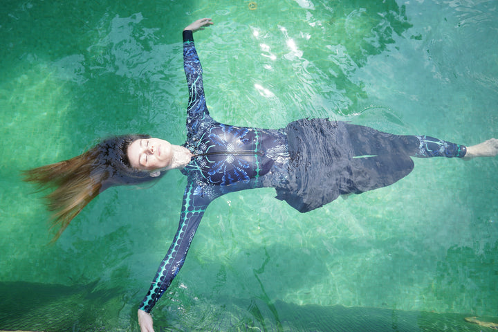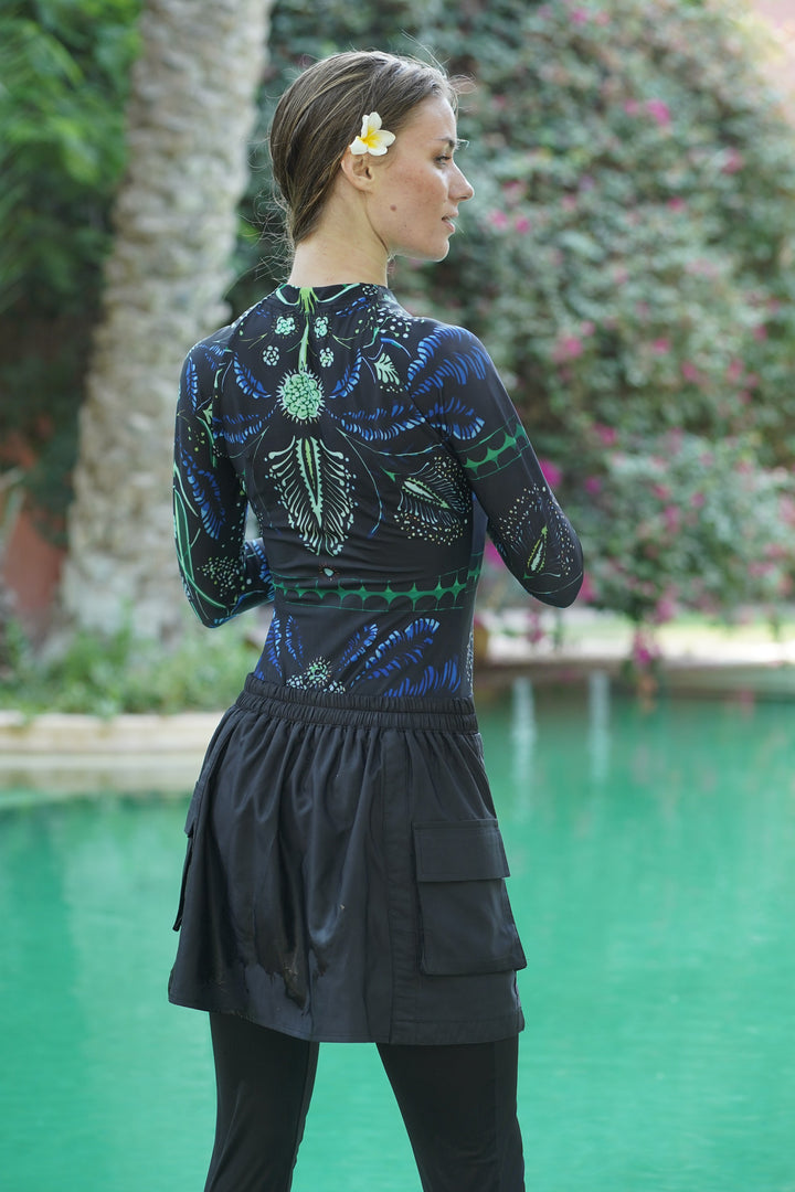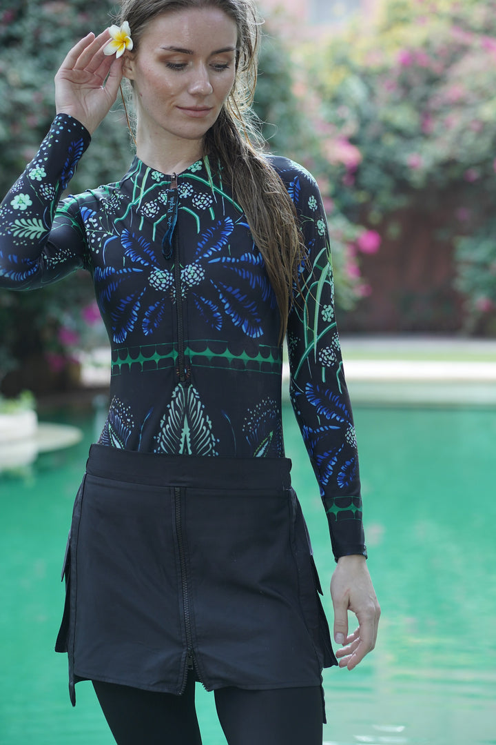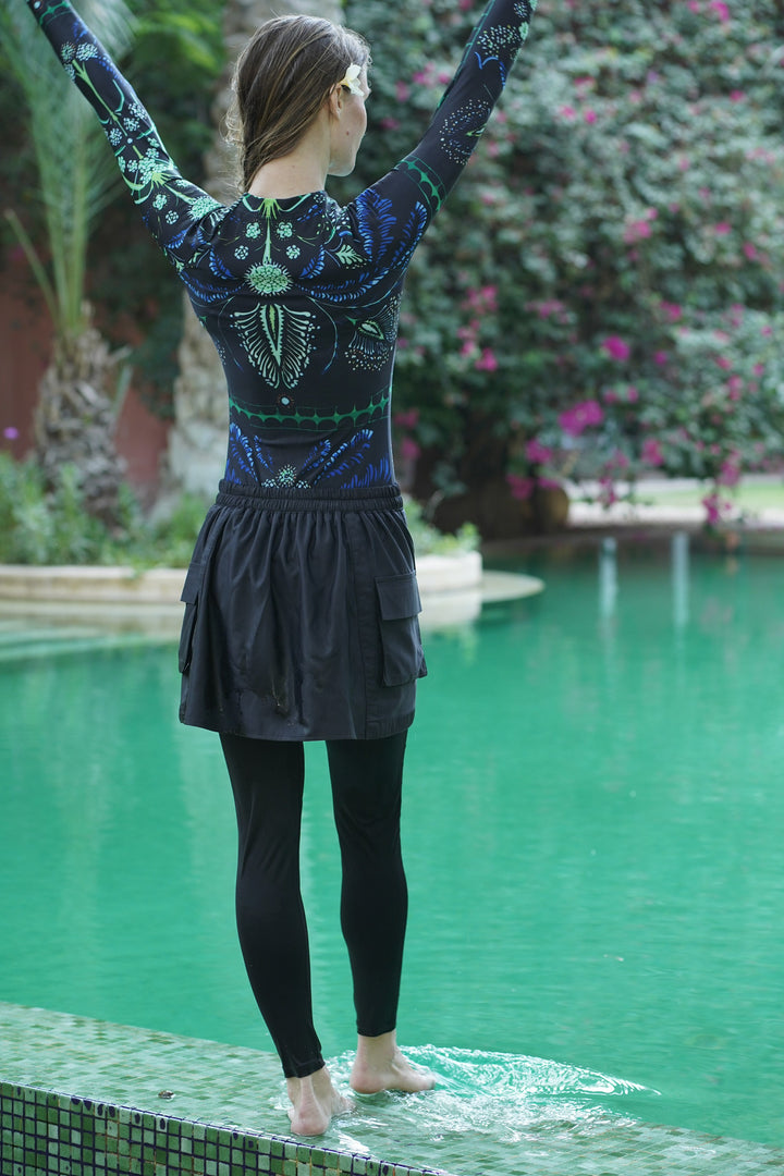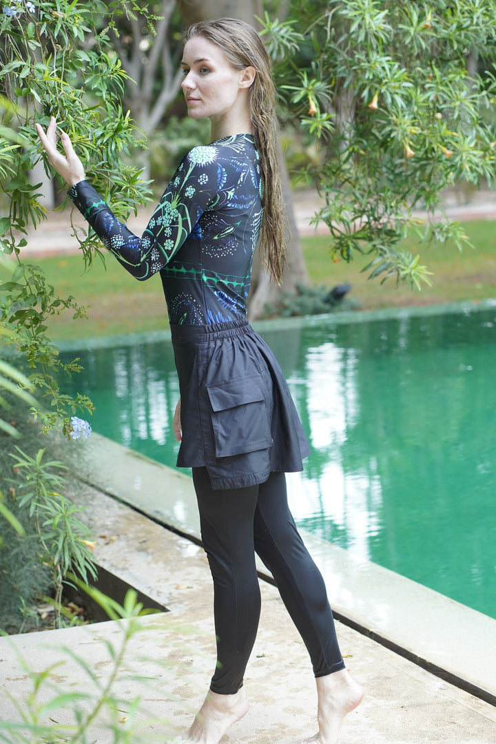 You will find a matching legging extension on the website. It’s a seperate small piece to be worn over your leggings to match your swimsuit and give the whole outfit a coherent look.