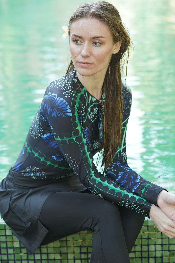 We paired 95% of our rashgaurds on black so if you already have a pair of black leggings, you don’t need to purchase new ones. If you’d like to renew yours, you’ll find swim leggings on our website