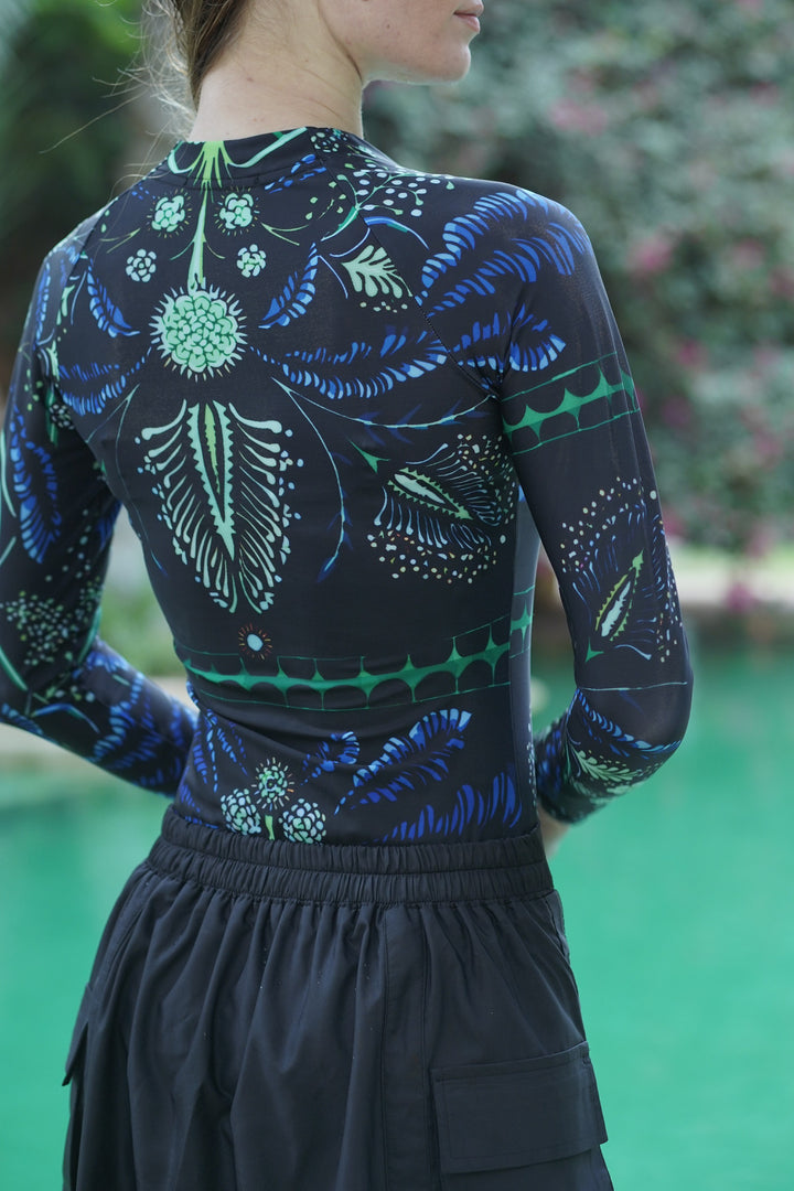 For the perfect fit and support, this rashguard should be worn over a solid-colored, preferably nude, padded sports bra. Avoid any pattern or bright colors in your sports bra.