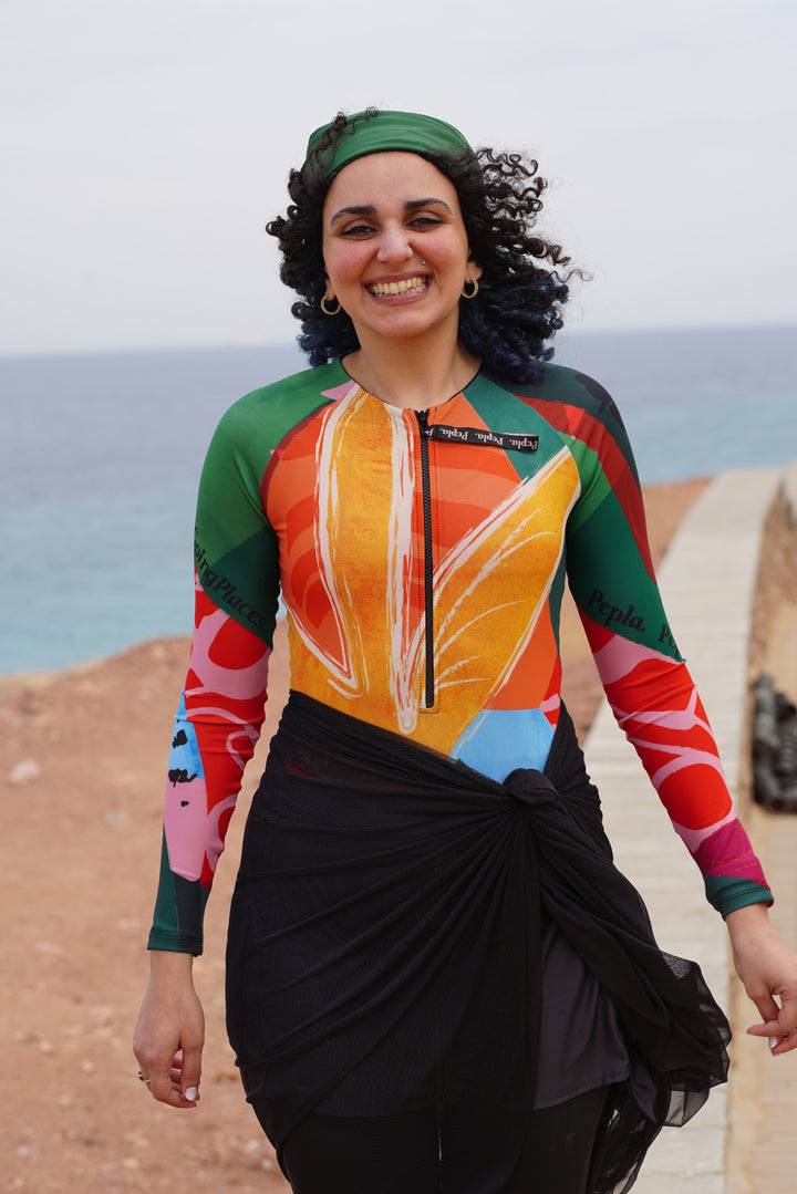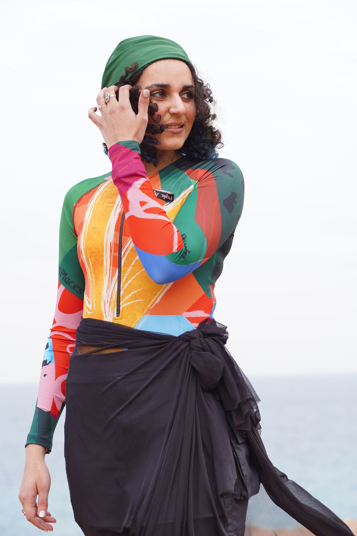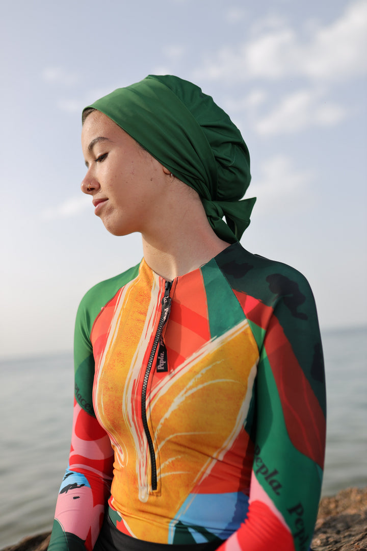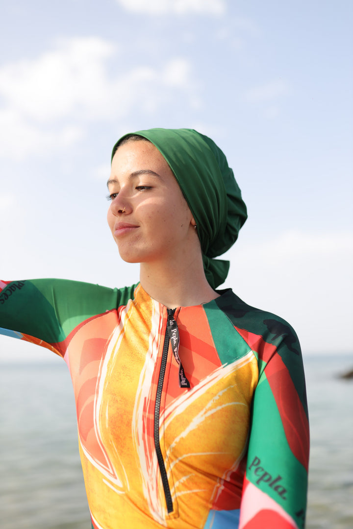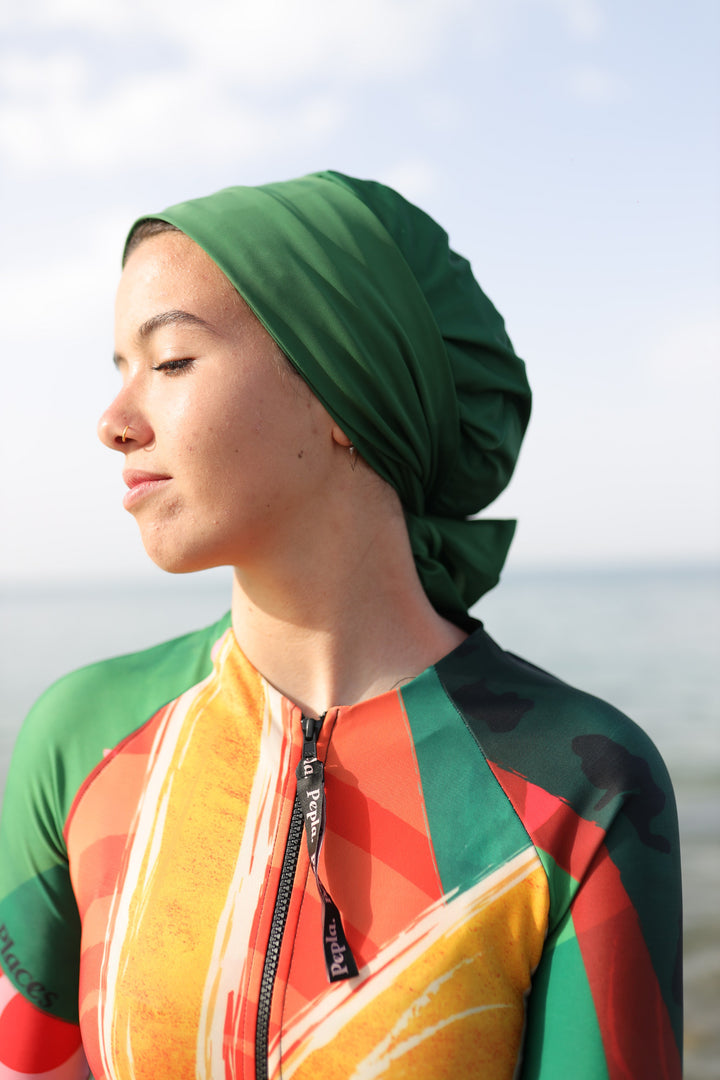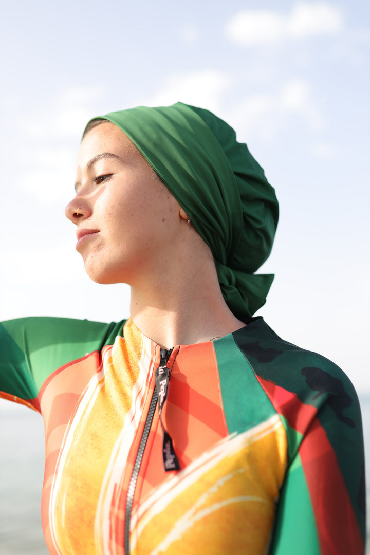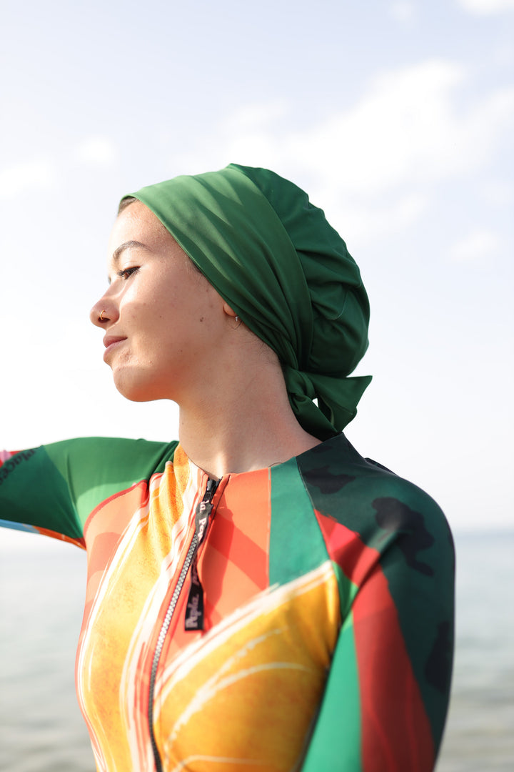 Introducing our Swim Turban, the ultimate blend of style and functionality for the modern, modest swimmer. Designed to offer both protection and flair, this innovative swim cap is a game-changer in the world of modest beach fashion.